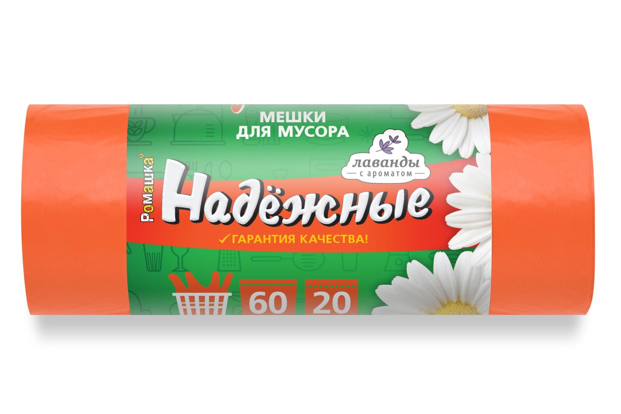 Мешок для мусора 60л рулон ПСД (60х74)-15 оранжевые с ушками НАДЕЖНЫЕ 12г Ромашка (20шт) 1/20 купить в Екатеринбурге с доставкой оптом и в розницу