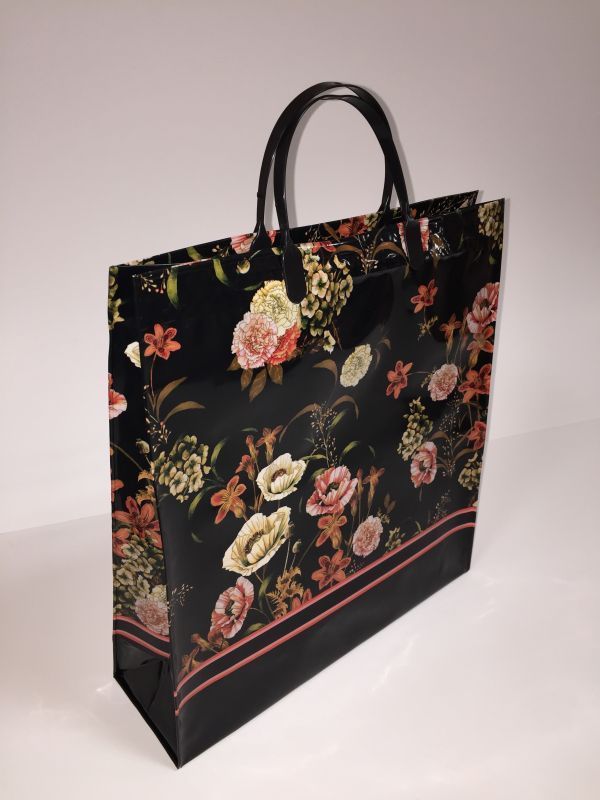 Пакет с пластмассовыми ручками (35х36+10) объемный Цветы на черном 10/50